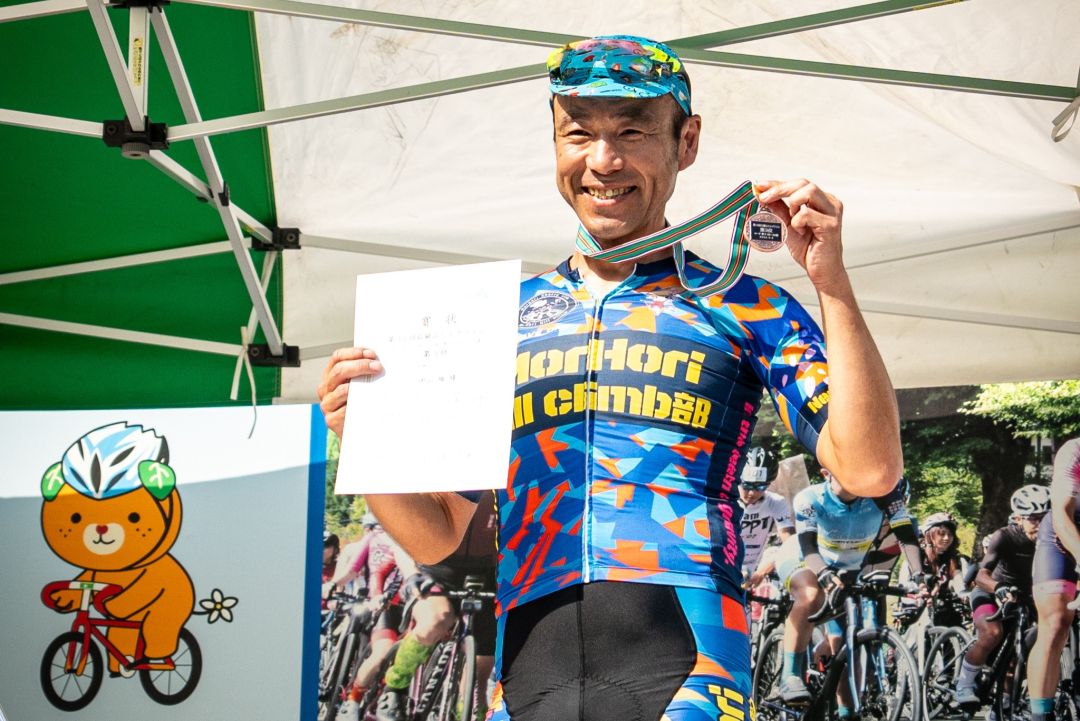 40代前半までバレーボールを続けていましたが、靱帯損傷という大ケガをきっかけに、リハビリ目的で自転車を始めました。46歳でモー堀ヒルクライム部に誘われ、本格的にヒルクライムの世界へ。富士ヒルには毎年挑戦し、49歳・50歳・51歳と3年連続ゴールドリング(年代入賞・優勝・準優勝)を獲得し、昨年は選抜クラスにも出場しました。今年の目標はゴールドリング獲得、61分代年代別優勝です。