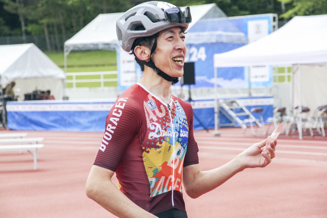 特技は、体型を見ただけで『ビオレーサーのジャージサイズ』をピタリと当てること!初めてビオレーサーを着る方や、サイズ選びで迷っている方がいたら、相談に乗りますので気軽に声をかけてください。では、富士ヒルに向けて、一緒に楽しんでいきましょう!」
